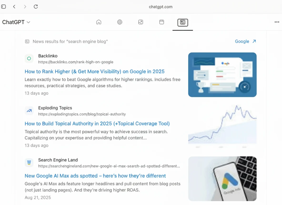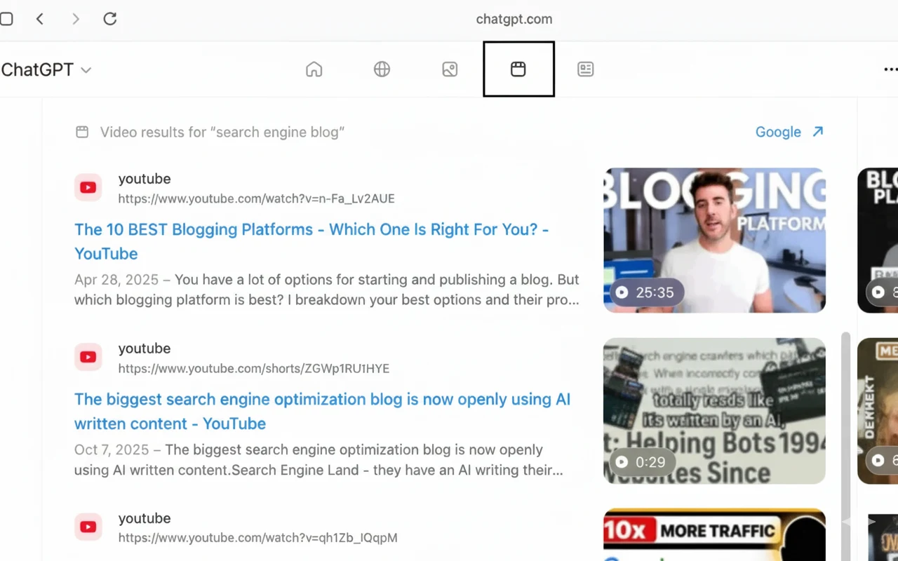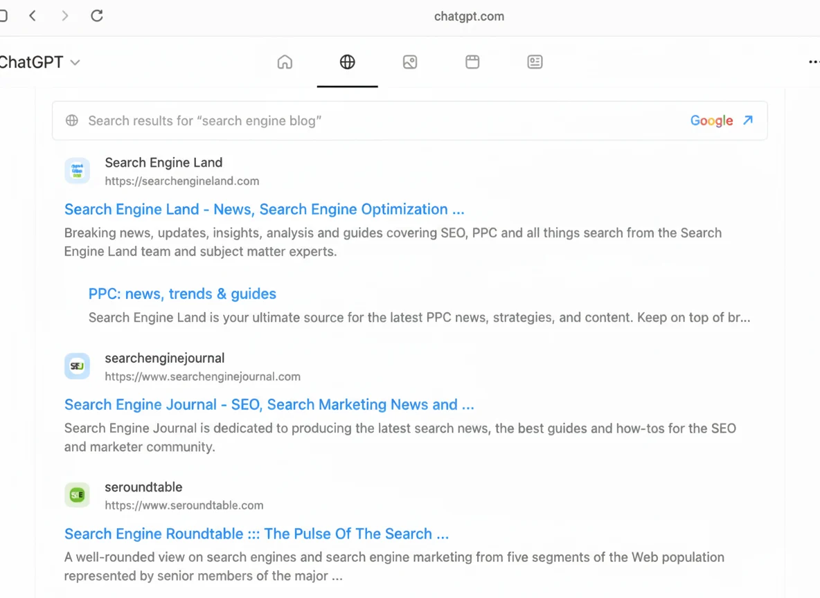 When searching within Atlas to ChatGPT, the browser will provide ChatGPT-style answers along with search-result tabs, like Web, Images, Videos, News, etc. — much like the existing search engines. Intriguingly, when the user clicks on those buttons, the results are tied to Google Search.